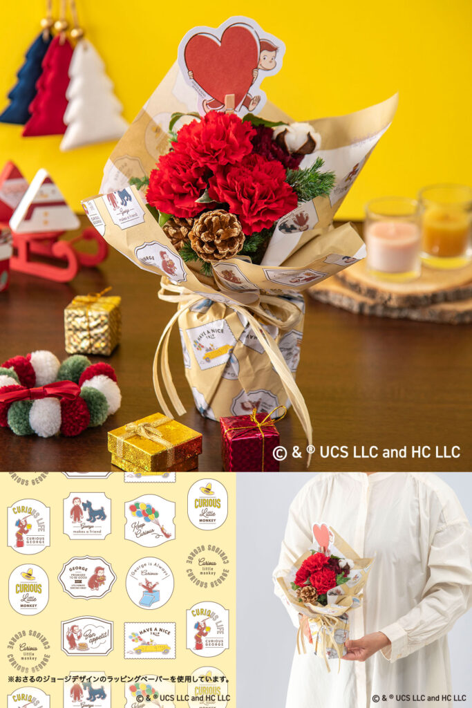 「Life’s better with you!(あなたがいると、人生はもっと素敵になる!)」のメッセージ入りハートとジョージ、黄色い帽子のおじさんが描かれたイエローカラーのボックスに、生花のような色鮮やかな美しさとソフトな風合いを長期間にわたって保ち続けるプリザーブドフラワーの赤バラやドライの実物をたっぷりとアレンジしたボックスフラワー。赤いカーネーションをメインにクリスマスカラーの生花を束ね、楽しげなジョージが描かれたペーパーと大きなハートから覗き込むジョージが可愛らしいタグでラッピングした花瓶要らずのそのまま飾れるブーケ。どちらもこれからのクリスマスシーズンのギフトにぴったりです。