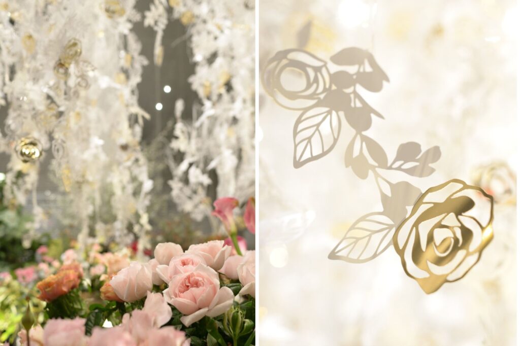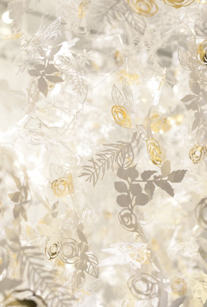 本インスタレーションの核となるのは、「nekonekodesign PAPER ARTS」菅野一剛氏がデザインしたオリジナルペーパークラフトです。クリスマスのテーマである「バラ」をモチーフとし、最高品質の赤いバラを引き立てるホワイトとゴールドのカラーリングで仕上げています。