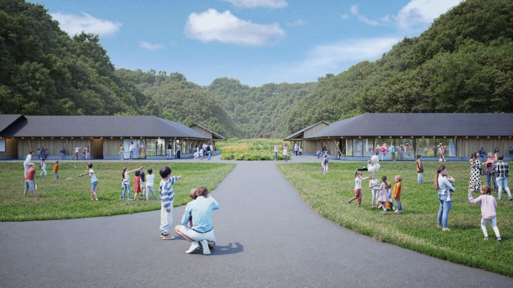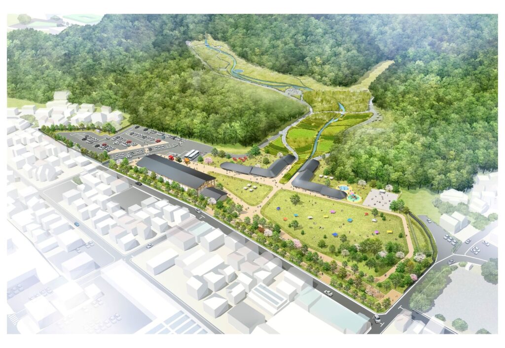 「人と人」「人と自然」「人と歴史」の関係性を軸に、地域資源を活かした体験や学び、交流、災害時の備えを統合的に設計。芝生広場やレストラン、体験施設、防災拠点などの導入機能により、多世代が関わり、暮らしと地域がつながる場づくりを進めます。