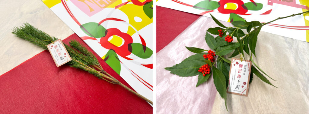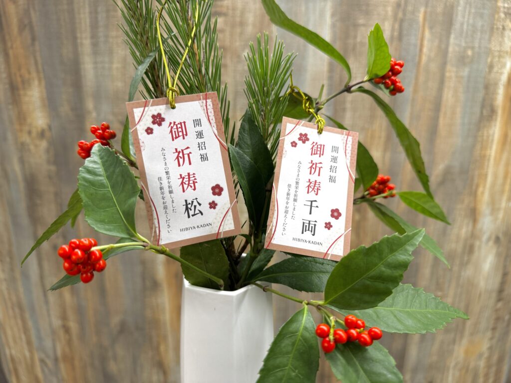 「御祈祷松」および「御祈祷千両」は、いずれも開運招福を願う清めのタグを添え、首都圏を中心とした日比谷花壇の店頭にて数量限定で取り扱います。