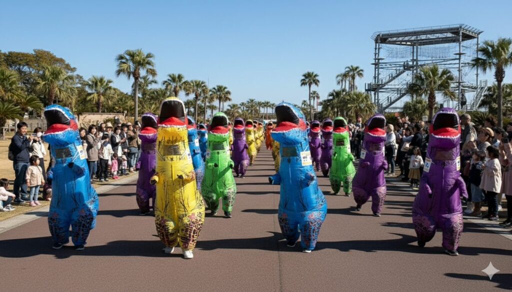 さらに今回は、レースをさらに熱く盛り上げる特別なプログラムとして、初の試みとなる「ティラノパレード」を実施予定。色とりどりのティラノサウルスたちが音楽に合わせて園内の中央園路を踊り歩く、史上最高にカオスな光景が広がります。