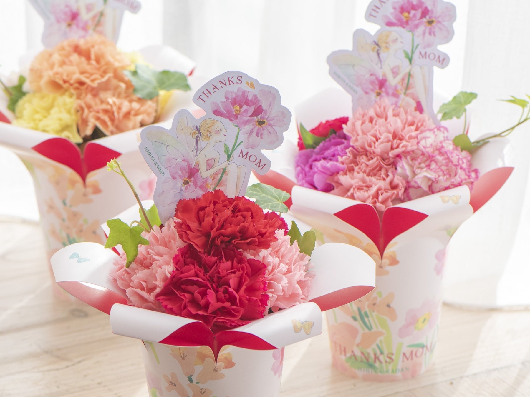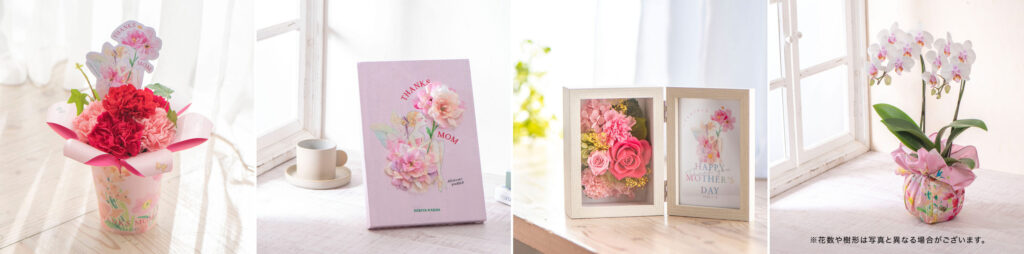 このほか、環境に配慮した紙製の器を使用したそのまま飾れる花束「シュシュフルール」や、雑貨・スイーツとのセット、カーネーションやアジサイをはじめとした季節の花鉢など、お母さんや贈る方の好みに合わせて選べる多彩な選択肢を取り揃えています。
