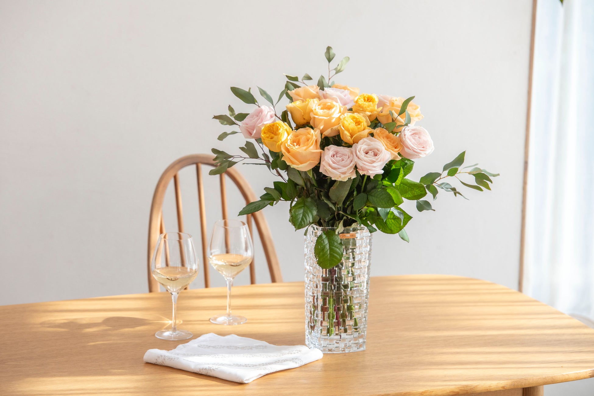 津軽の職人たちの巧みな技術と技法によって、手づくりならではの柔らかな形に仕上げた「津軽びいどろ」のフラワーベースに国産の美しいお花をセットにしました。1200度以上の炎と職人の息吹から生まれた津軽びいどろは、手にするたびに深みを増す、一生ものの工芸品です。お花がない時期でも、窓際に置くだけで光を透過し、美しいオブジェとして楽しめます。 お母さんの日常に、色褪せない光の彩りを添えてみませんか。
