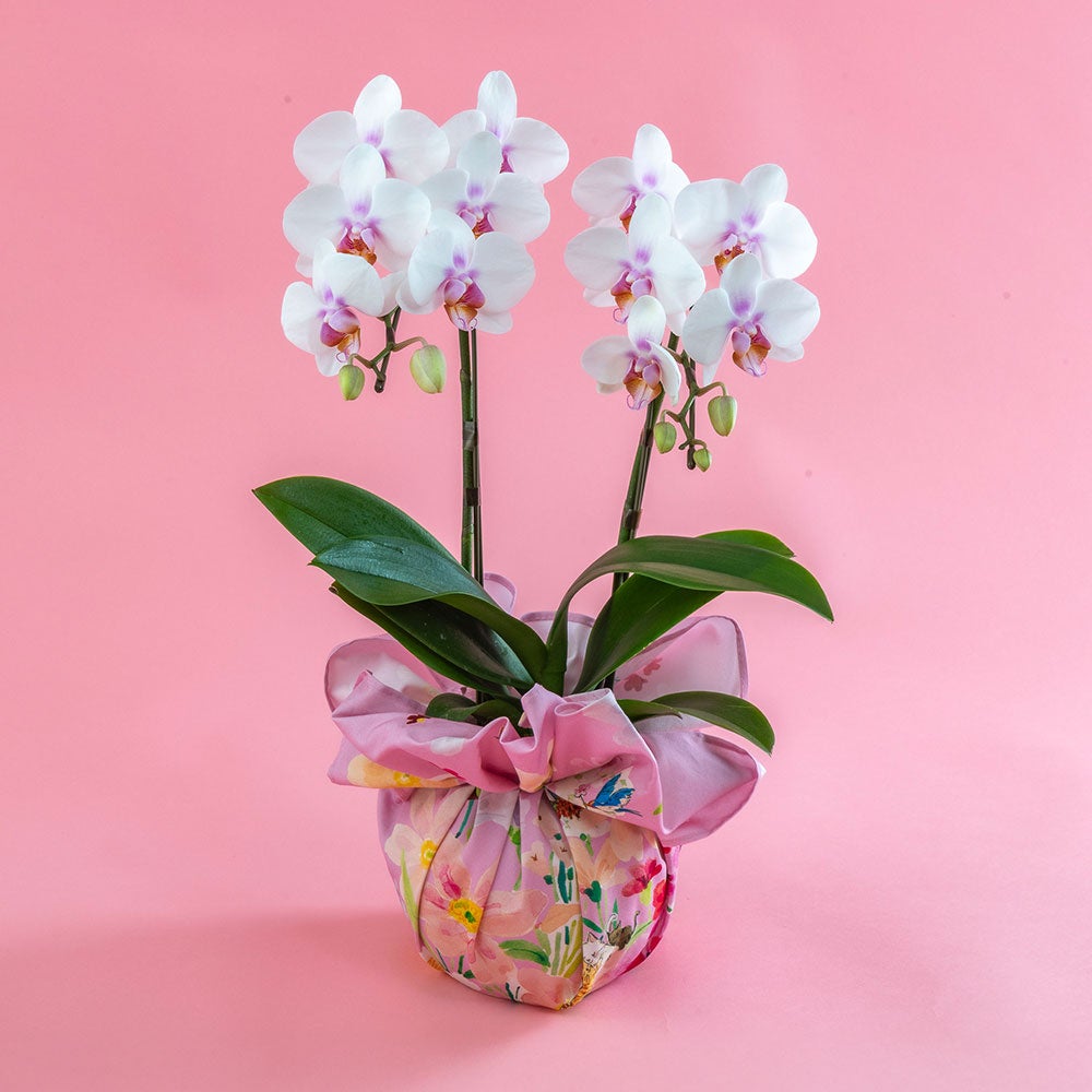 イラストレーター湯浅望がデザインしたオリジナル風呂敷で包んだミディ胡蝶蘭。白花の中心にほんのりピンクがのった可憐な花で、見る者の心を惹き付けます。大切なお母さんに感謝の気持ちを贈ります。