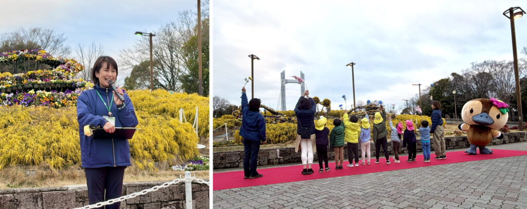 開催前日に実施したイルミネーション点灯式では、木場公園の公園長のほか、江東区観光キャラクターのコトミちゃんや、一部装飾の植栽に参加した木場公園近隣の保育園児たちも登壇。子どもたちの元気な掛け声とともに、イルミネーションが点灯しました。