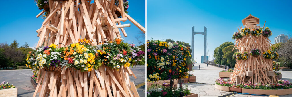 イベント広場の中央には、かつて木場の水路を照らした灯を思わせる、高さ約3.5mの常夜灯オブジェが登場。江戸時代から伝わる、水辺に浮かべた材木を鳶口で乗りこなす「木場の角乗(かくのり)」の象徴でもある角材を使い、その質感に合わせて日比谷花壇が厳選した季節の花々を鮮やかに植え込みました。花屋の知見を活かし、色彩の重なりや品種の個性を引き出すことで、木の風合いと早春の花々が調和した、一体感のある景観を実現しています。