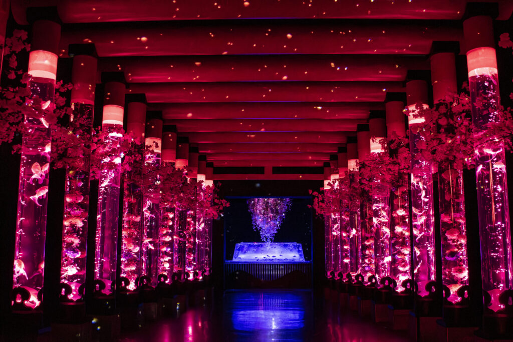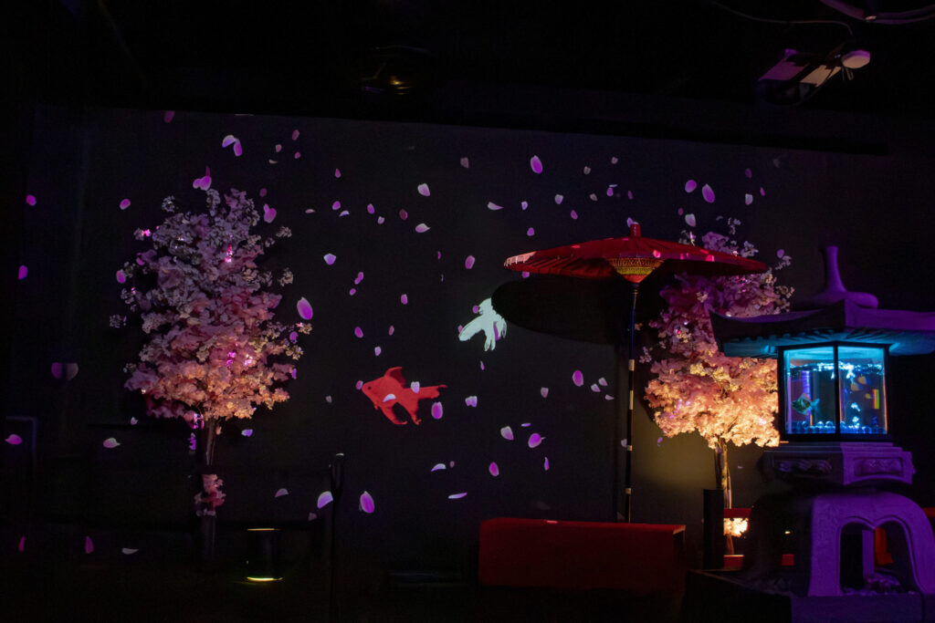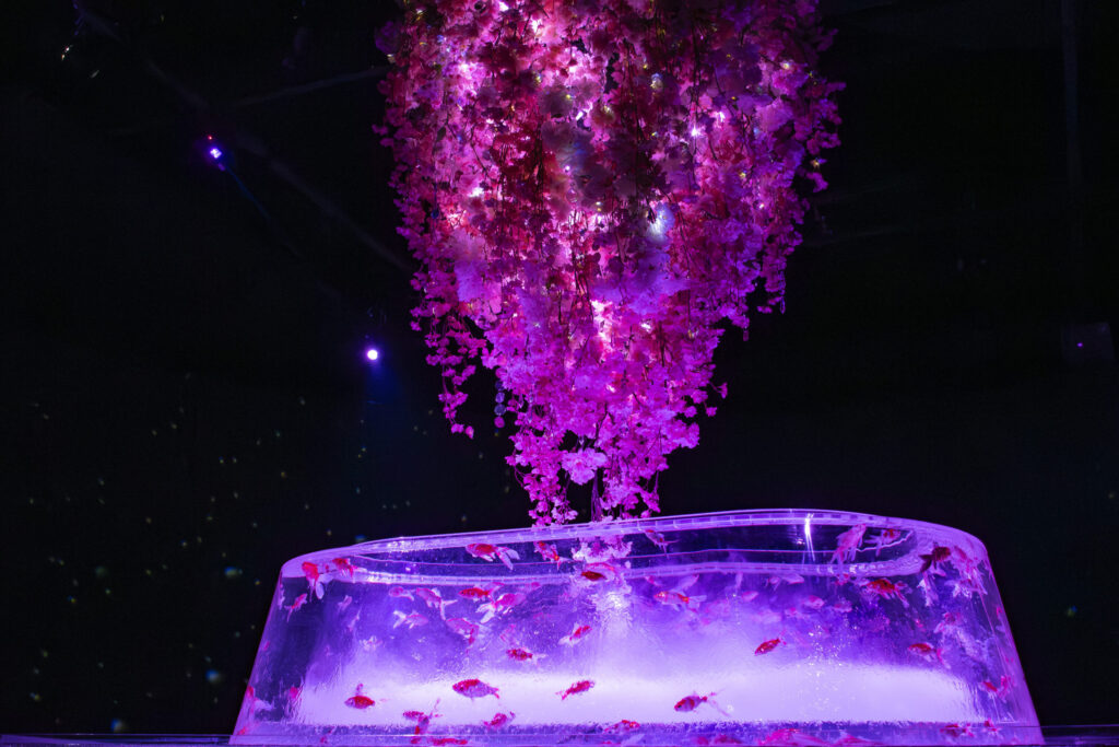 桜を道しるべに、金魚、光、そして花が一体となる幻想的で華やかな空間を創出します。