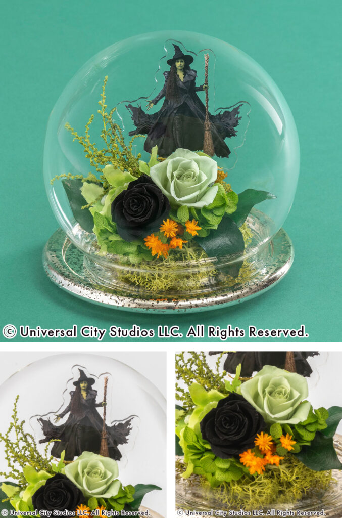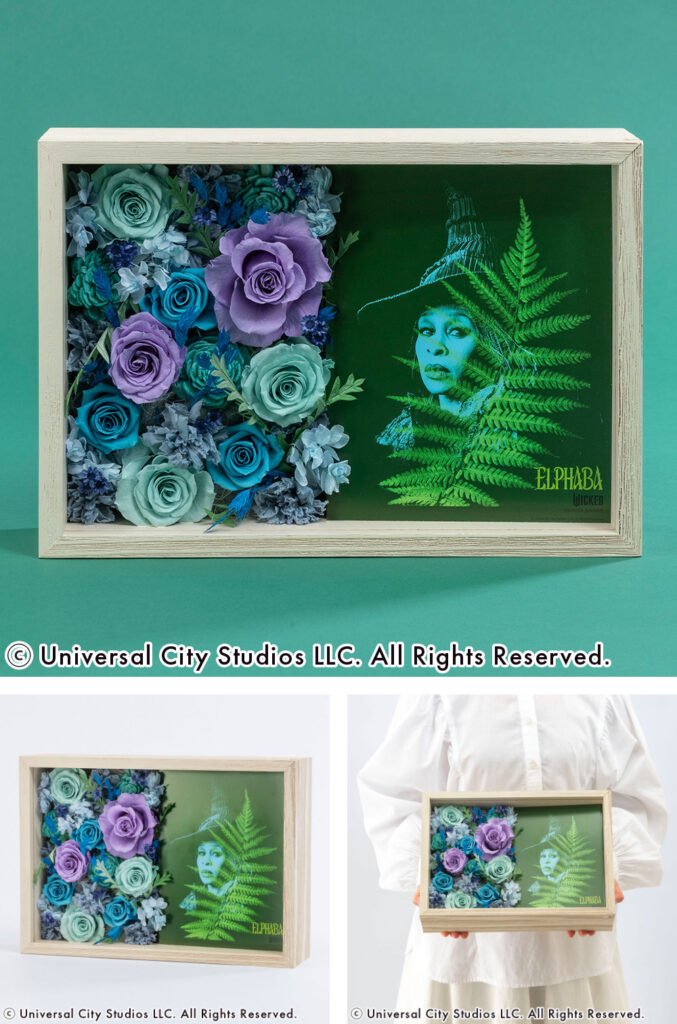 ラインアップは、デスクや棚などお好みの場所に飾って映画の感動をいつでも身近に感じられるアレンジメントタイプと、壁掛けとしても楽しめるフレームアートタイプを合わせた全5種類。物語の風景が目の前に広がるような、作品の世界に没入できるこだわりが詰まった逸品です。すべてここでしか手に入らないファン必見のウィキッドアイテム。飾るとたちまち物語のドラマティックな世界広がるフラワーアイテムを、ぜひこの機会にお楽しみください。