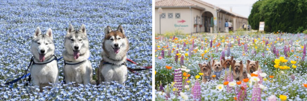 メインコンテンツである「ドッグパレード」では、青く広がるネモフィラの花畑を眺めながら愛犬と一緒にパレードいただけます。パレード終了後には、ネモフィラを背景に愛犬と記念撮影を実施予定。
