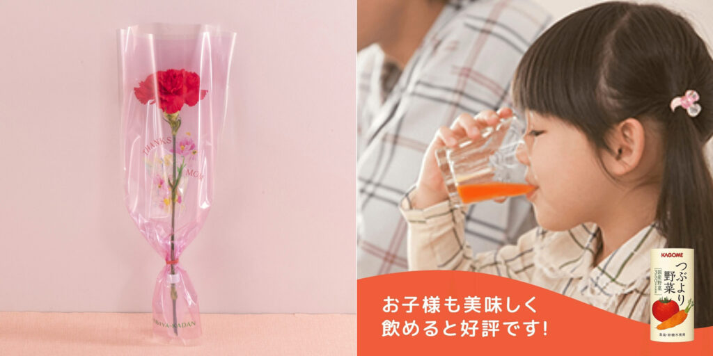 園児1名につき、株式会社フレネットHIBIYA協賛によるラッピング済みのカーネーション1本と、カゴメ株式会社による協賛品の野菜ジュース1本のセットを、ご応募いただいた中から抽選で当選された園へ無料でお届けします。
