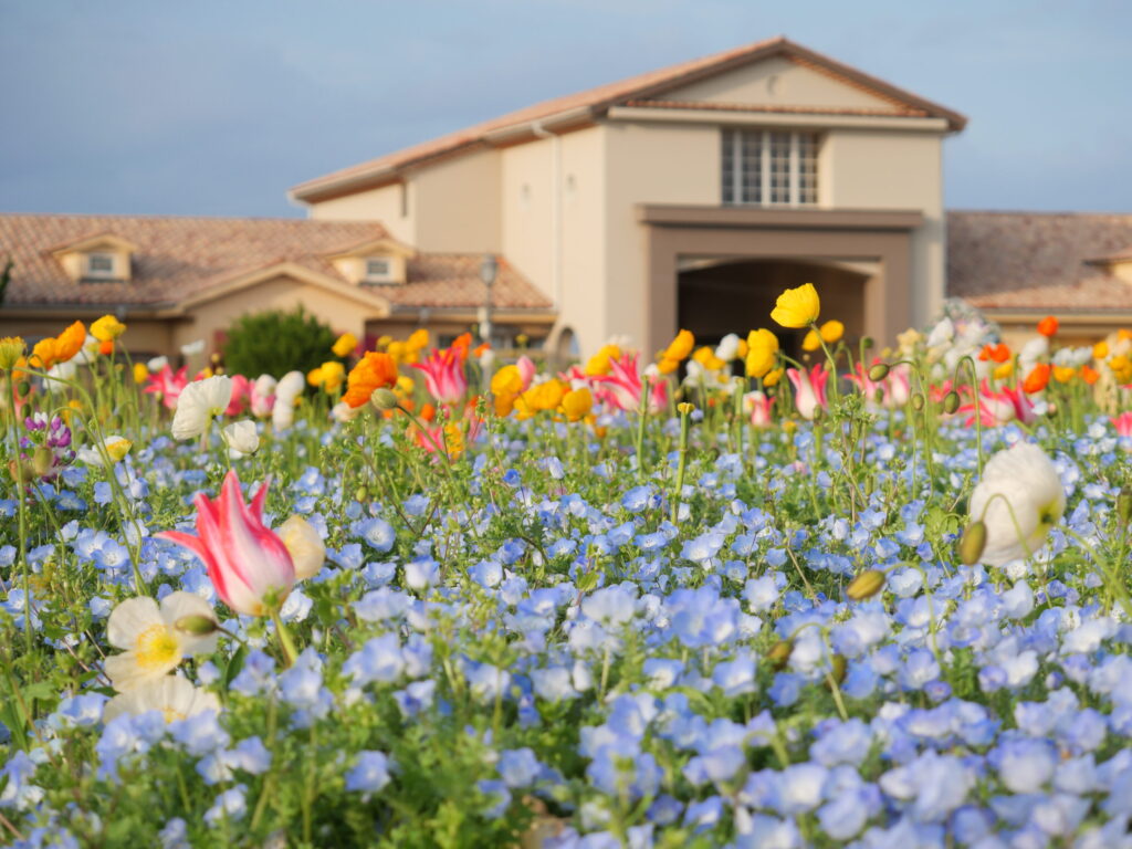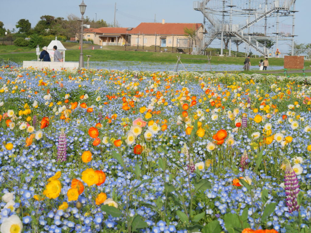 ※フラワーガーデンウエストでは、ネモフィラのほか、ポピーやチューリップなどの春の花とのミックスで開花